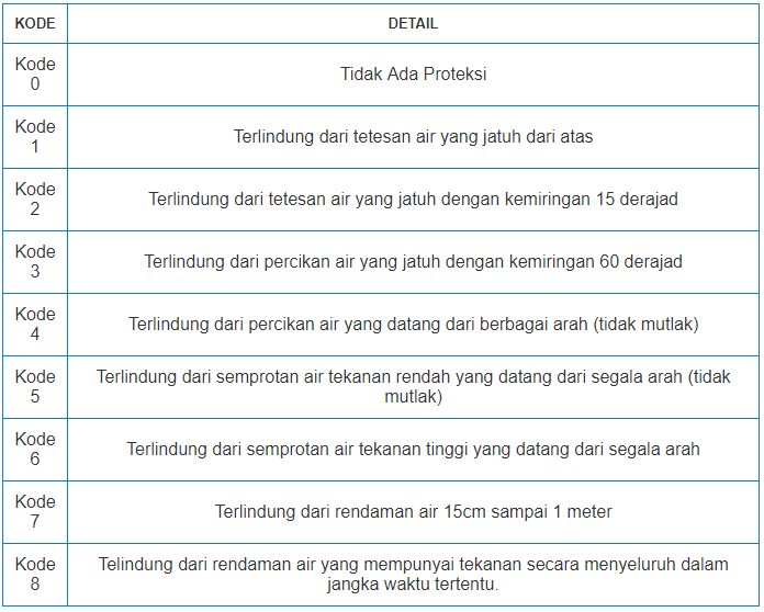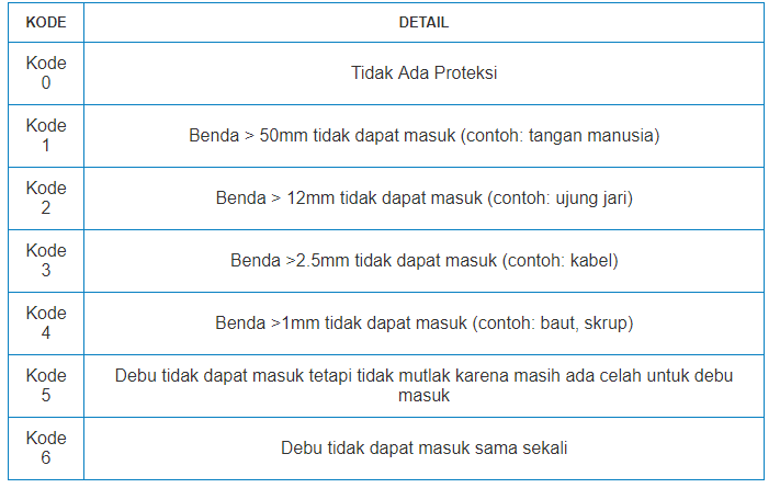 Format Penulisan Ingress Protection yaitu IP “Digit Kode Pertama” “Digit Kode Kedua” berikut untuk penjelas tentang kode-kode pada Ingress Protection
